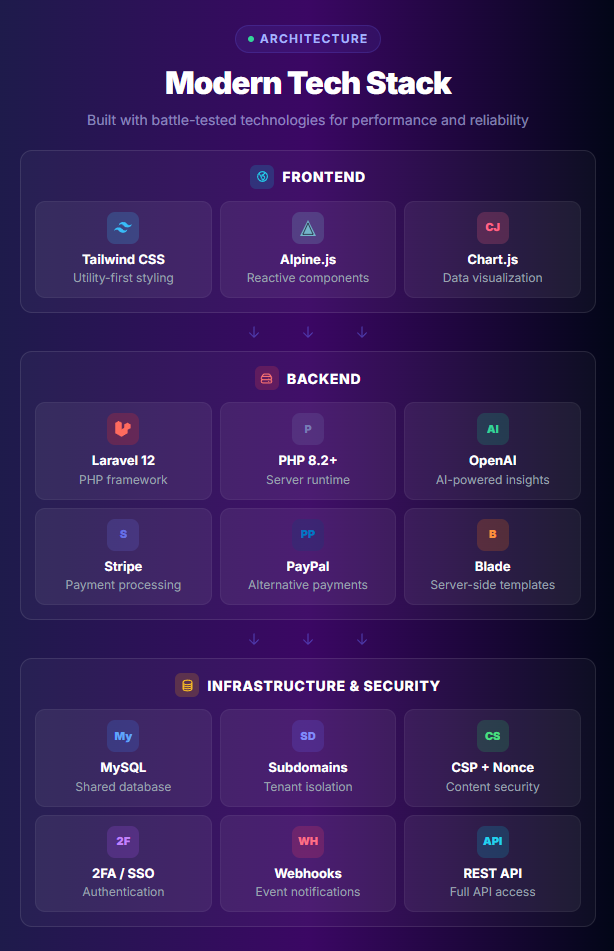 - Modern stack – Laravel, Tailwind CSS, Alpine.js, Chart.js. Clean, maintainable code.